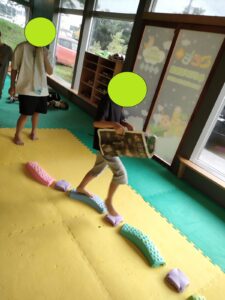 新聞紙の上にボールを乗せて、平均台などの障害物を乗り越えていきます!