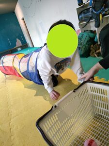 ボールを持ったまま狭いトンネルをくぐり抜けていく遊びです(^^♪