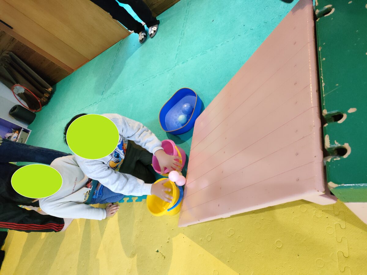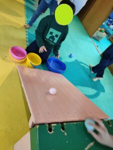 転がってきたボールの色を手元にある箱と同じ色に入れていく遊びです( *´艸`)